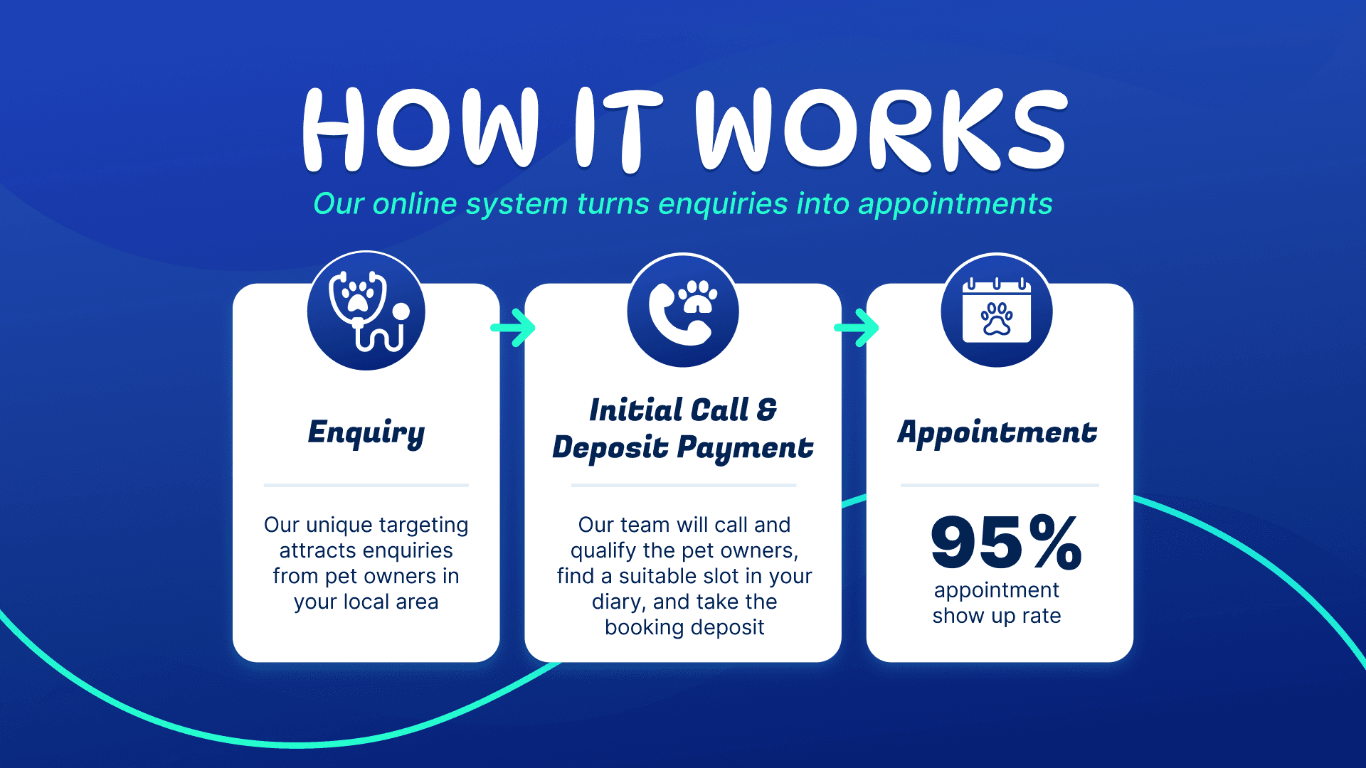 We call and qualify every enquiry, securing an upfront booking deposit, achieving a 95%+ show-up rate at your vet practice.